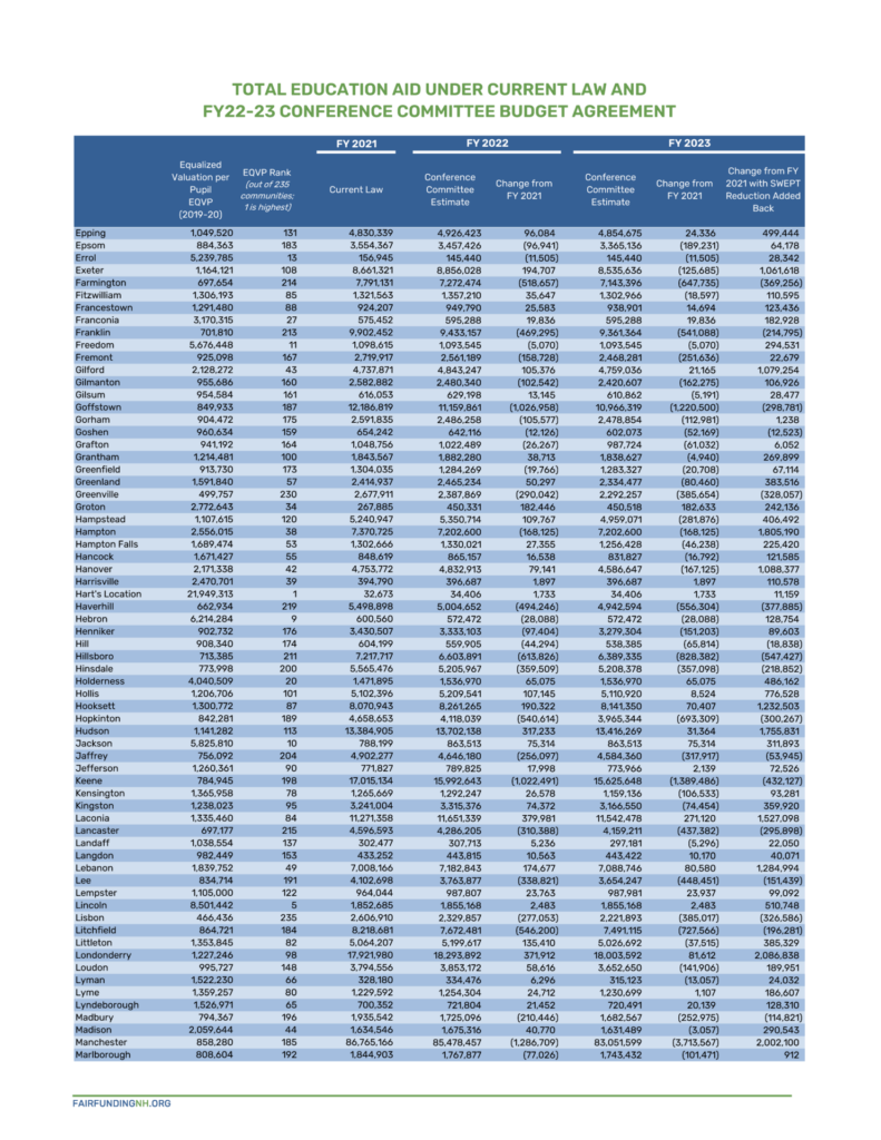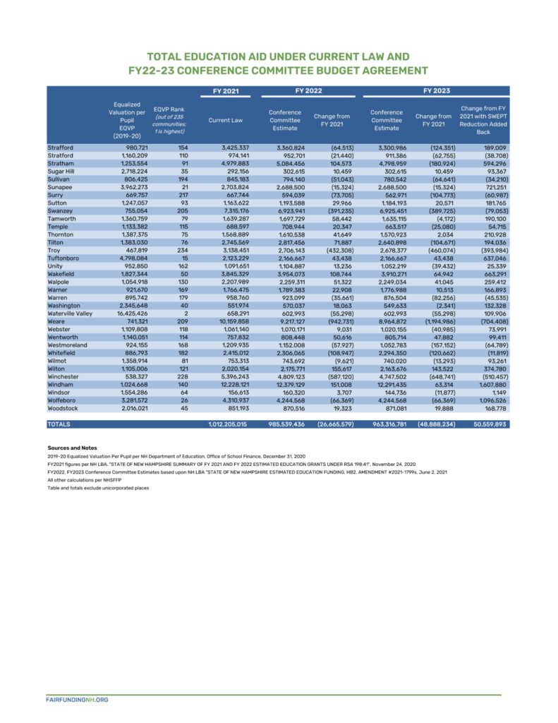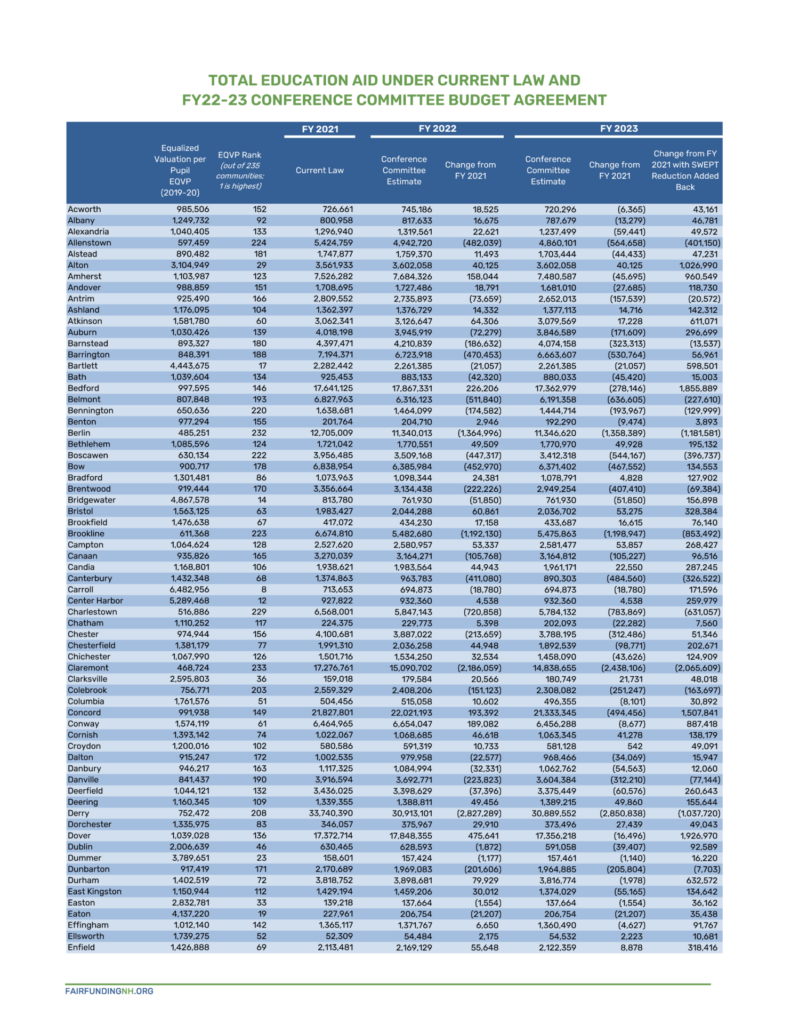 In sum, rather than moving New Hampshire closer to creating a funding system that ensures every school has the resources it needs to provide an excellent education, the proposed FY22-23 budget would leave many students and communities further behind.