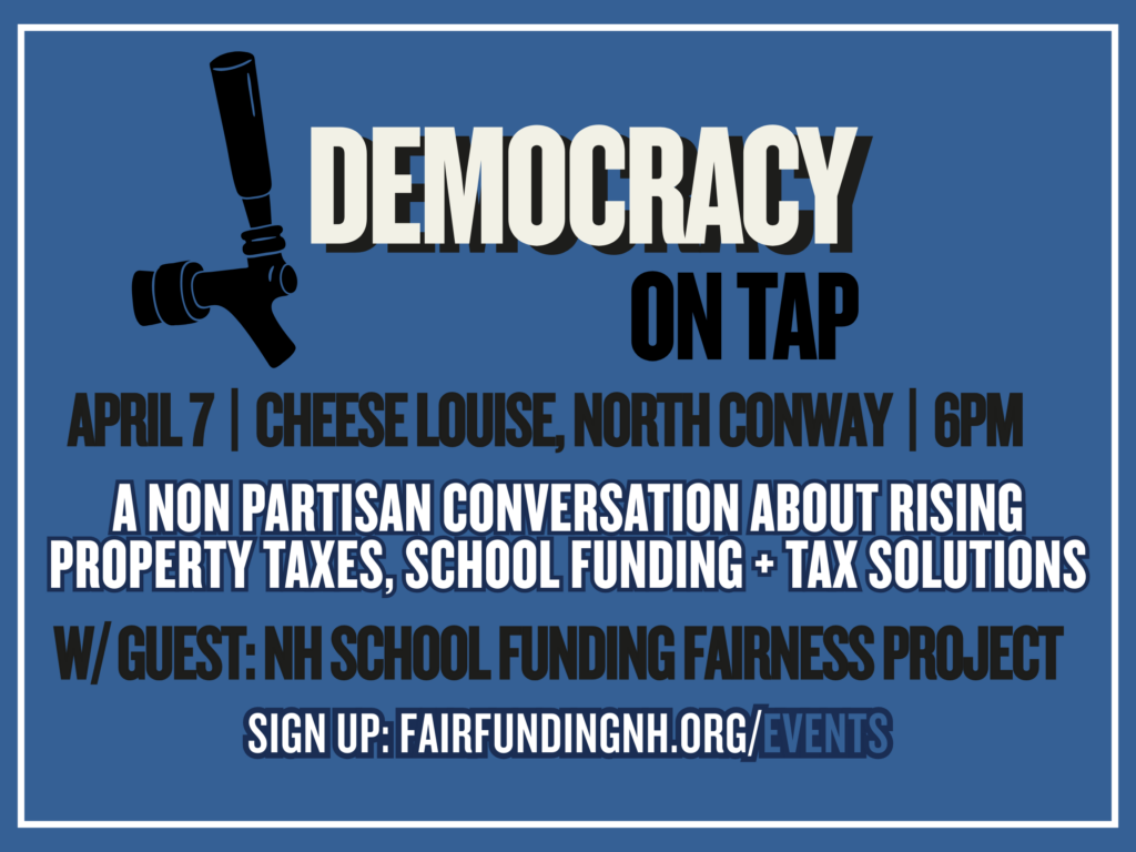 Join us for Democracy on Tap, a nonpartisan gathering led by a group of concerned North Country citizens focused on discussing the most pressing issues facing Granite Staters today. Democracy on Tap will be hosting the NH School Funding Fairness Project at Cheese Louise in North Conway for a conversation on school funding and property taxes. Together, we’ll explore how NH funds public education, and how that system contributes to the growing and unsustainable property tax burden. We’ll look ahead to 2027 and share ideas about what a fair and sustainable revenue solution could look like for everyone.