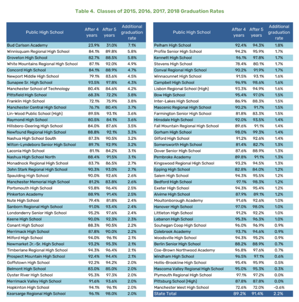 Based on DoE’s published data, the 4-year cohort graduation rate for all public schools in New Hampshire for the Classes of 2015, 2016, 2017, and 2018 combined was 89.2 percent. However, once students who graduated in five years during that time frame are included, the graduation rate climbs to 91.4 percent. The students that comprise that additional 2.2 percent are indeed high school graduates, but just not counted in the 4-year cohort data.
