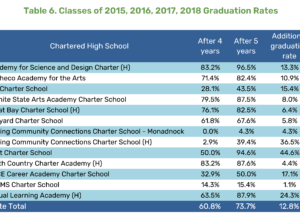 Table 6 contains the graduation rates by combining the four classes of 2015, 2016, 2017, and 2018. As was done with the public high schools in Table 4, both the 4-year cohort rate and 5-year cohort rate are displayed. This table is in alphabetical order.