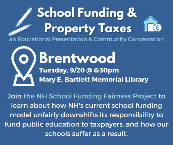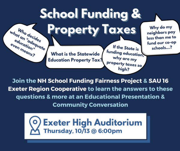 Join NHSFFP and SAU 16 at Exeter High School for a community presentation on why each town in a cooperative school district pays a different amount to fund education. You will also learn how our school funding model creates huge disparities in property taxes and the quality of education across the state.