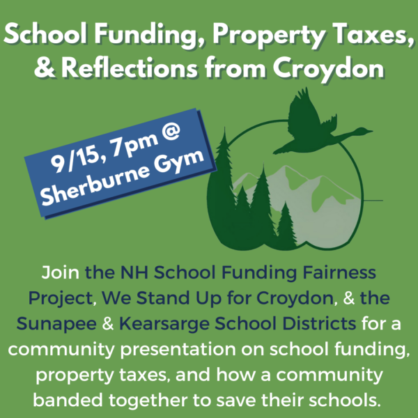 Join NHSFFP, We Stand Up for Croydon, and the Sunapee and Kearsarge School Districts at Sherburne Gym in Sunapee for a community presentation on school funding, property taxes, and how a community banded together to save their schools.