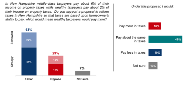 After learning the disparity between state and local funding, three in five respondents favored changing to a statewide funding approach. Overall, 63% of Granite Staters favored a proposal to reform taxes so that taxes are based upon a homeowner’s ability to pay, while 29% opposed this proposal. Even the 18% who felt they would pay more in taxes were divided about the proposal, with 49% opposing the proposal and 46% in favor of it.