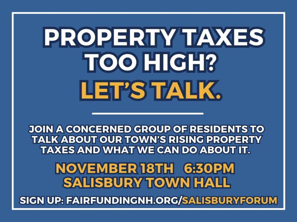 Join your neighbors for a nonpartisan community gathering focused on one of Salisbury’s most pressing issues: rising property taxes, how they’re impacting our ability to stay in our homes, and how it is tied to the way our public schools are funded in New Hampshire.