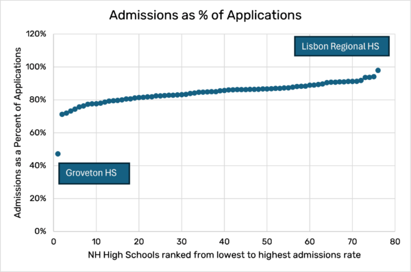 While the percentage of applications demonstrates a potential interest in going to UNH, not all students are admitted. Measuring admissions to UNH as a percentage of the applications submitted can offer us a glimpse into the performance of each school’s college-bound students.