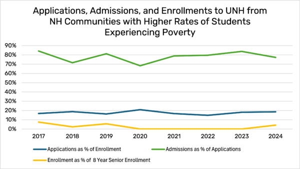 The data in this paper reveal that students from New Hampshire high schools with higher eligibility for FRL are less likely to apply to, be admitted to, and enroll at the University of New Hampshire than those from schools with lower eligibility. Although admission rates are relatively consistent across school types, lower application and enrollment rates suggest that the most significant barriers occur before and after the admissions decision.