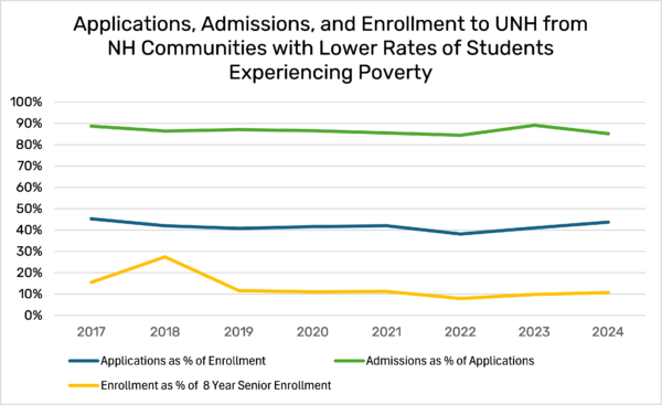 The graph shows consistently higher levels of engagement in the UNH admissions pipeline. From 2017 to 2024, application rates from these schools hovered between 38% and 45% of the graduating class, more than double the rates seen in the sample of high-eligibility schools. Admission rates remained strong and stable, consistently in the mid-to-high 80% range. Most notably, enrollment rates from low-eligible schools were significantly higher throughout the entire period, ranging from 7.94% to 27.46%, compared to years of 0% enrollment from their higher-eligibility counterparts. This steady engagement—across applications, admissions, and actual enrollment—illustrates a more direct and successful pathway from high school to college and reflects the structural advantages that students in lower-eligibility communities often have access to.